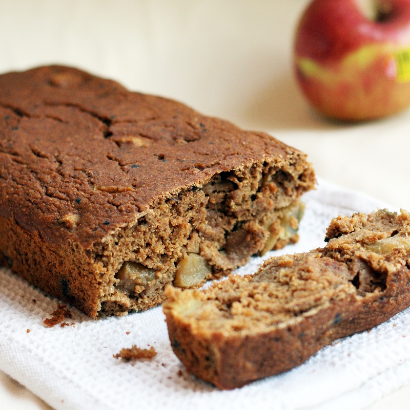Preheat oven to 350F.  In a large bowl, combine first 10 ingredients.  Whisk together.  Add in egg whites, applesauce, vanilla, molasses, and apple cider, and mix until a smooth batter forms (it will be runny).  Fold in apple chunks.  Pour batter into a greased loaf pan and bake in preheated oven for 30 minutes, or until a toothpick comes out clean.  Let cool completely before slicing or removing from pan.